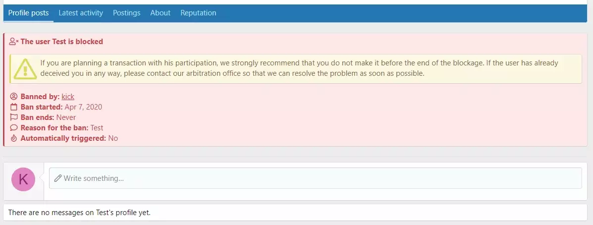 显示有关在用户的配置文件中阻止用户的信息。被阻止的用户将被删除所有隐私设置,所有注册用户和访客都可以看到他的个人资料,无论为被阻止的用户设置了什么隐私设置。默认情况下,只有论坛管理员或有权忽略隐私设置的用户才能查看被阻止用户的个人资料。