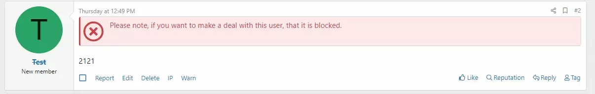 要设置查看被阻止用户的配置文件的能力,将显示权限。如果不说明阻塞的原因,它会给出 N / A 或取决于破解 XF 2,如果短语没有翻译,它会给出 N / A。用户卡中 90% 的短语取自引擎的短语,用户被阻止的短语和带有交易警告的文本取自插件的短语。此外,有关锁的信息输出是使用条件实现的,而无需扩展控制器。