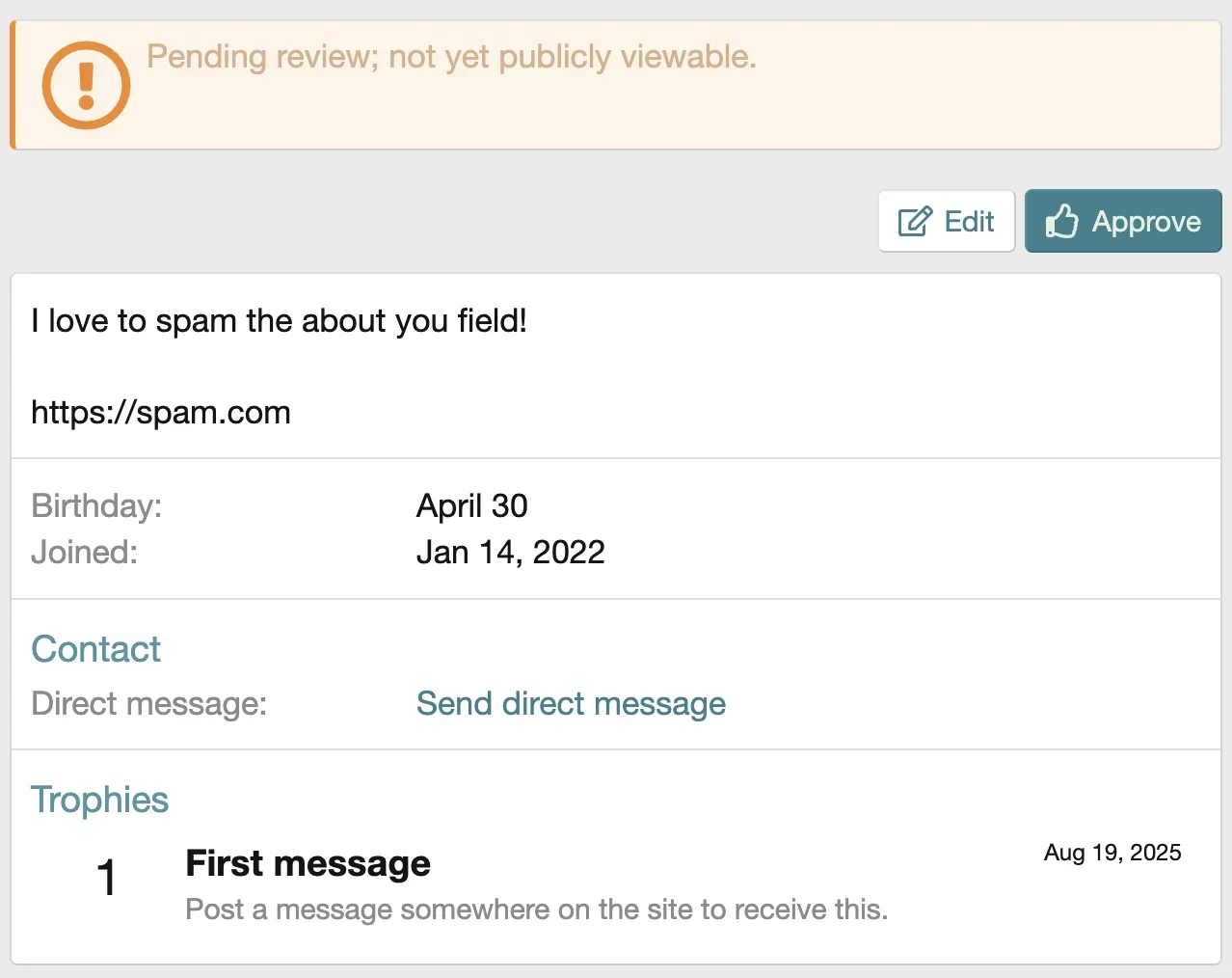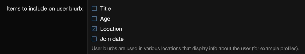 使用“网站”、“位置”和“关于您”字段的能力通过用户组权限进行控制。此外,您可以自动禁止尝试提交这些字段的用户(垃圾邮件机器人)。