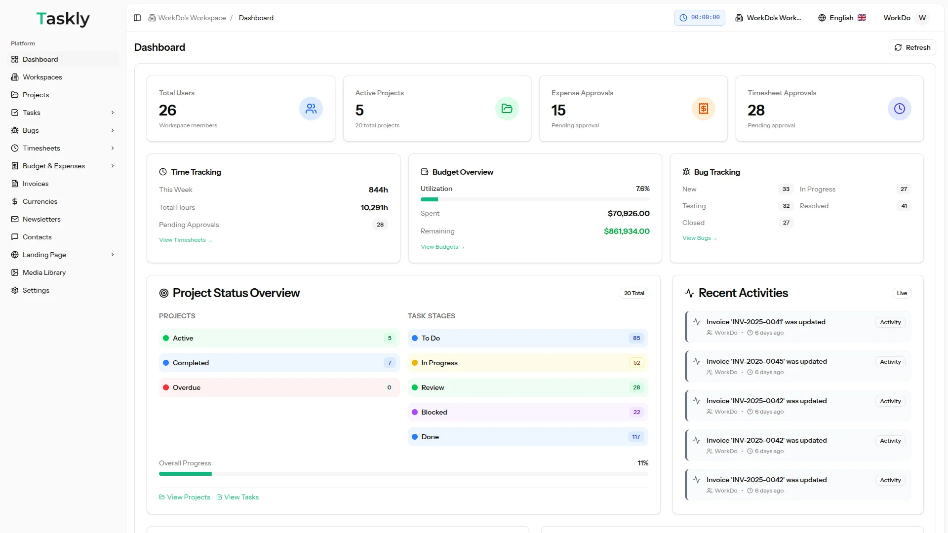 Taskly 是一款项目管理解决方案,它彻底改变了企业以无与伦比的效率和控制力组织、跟踪和交付项目的方式。这个综合平台将先进的项目规划、直观的看板、内置时间跟踪、预算管理、团队协作工具和发票生成结合到一个强大的生态系统中,无需多次昂贵的订阅。凭借支持无限用户和项目的多工作区架构、用于精细访问控制的基于角色的权限、具有可自定义阶段的实时任务管理、集成错误跟踪系统、费用管理、时间表和全面的报告仪表板,Taskly 使组织能够简化工作流程并优化资源分配。该平台采用响应式设计,可提供无缝的移动和桌面体验,支持全球团队的 15+ 种语言,包括用于客户计费的 30+ 支付网关集成,提供强大的文件管理和云存储支持,并提供广泛的自定义选项以匹配任何业务流程,使其成为完美的解决方案。
