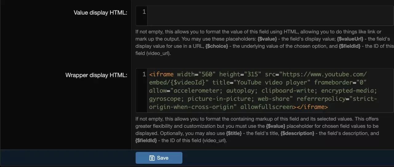 使自定义字段正则表达式捕获可供值和包装器显示 HTML 选项访问;适用于用户、线程、资源和媒体字段。例如,您可以从正则表达式 URL 字段中提取视频 ID。