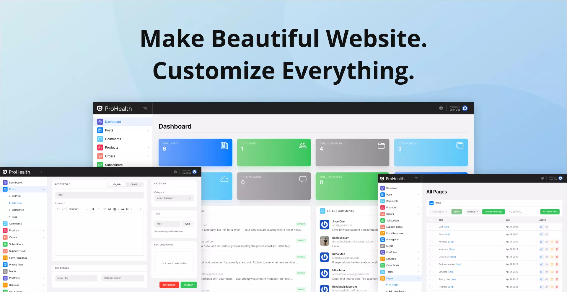 欢迎来到 ProHealth Laravel Script 的数字医疗保健的未来!ProHealth 是一个现代、强大的医疗保健解决方案,由 Laravel、React、MySQL 和直观的 LaraBuilder 实时页面构建器构建而成。该脚本专为医院、诊所、医疗中心和医疗保健专业人员设计,使您能够轻松创建一个完整的在线医疗平台。使用 ProHealth,用户可以直接从您的网站轻松浏览科室、查找医生和预约。无论您是经营多专科医院、私人诊所还是远程医疗服务,ProHealth 都能提供您所需的灵活性和功能,以提供无缝的在线患者体验。