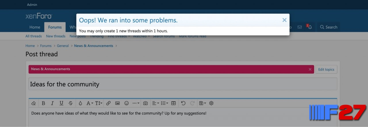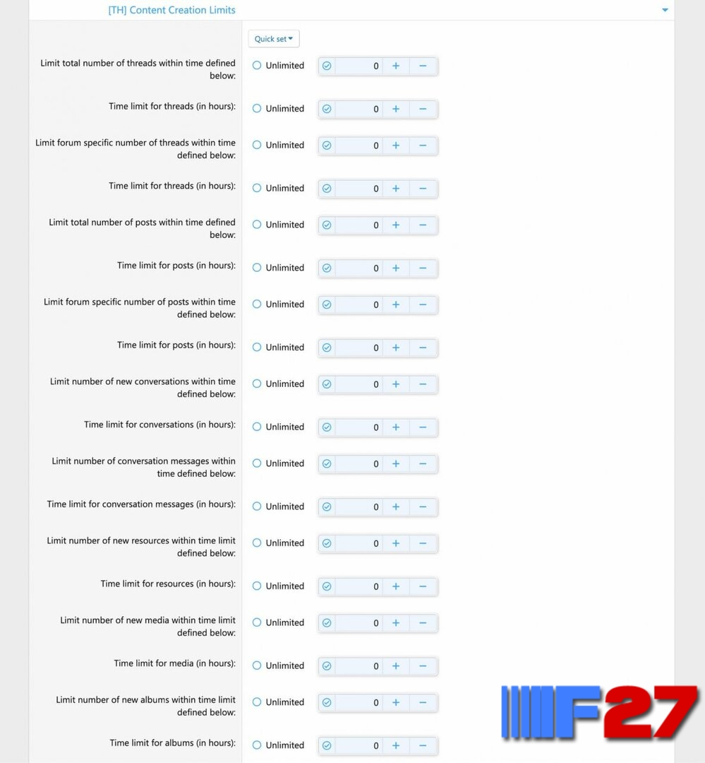 [OzzModz] Content Creation Limits - 控制帖子和其他内容的频率是确保良好性能、减少垃圾邮件和最大限度地减少重复帖子的关键部分。通过这些细粒度频率控制,您可以在特定时间段设置特定论坛的频率设置,并帮助减少具有其他用户生成内容功能的垃圾邮件。