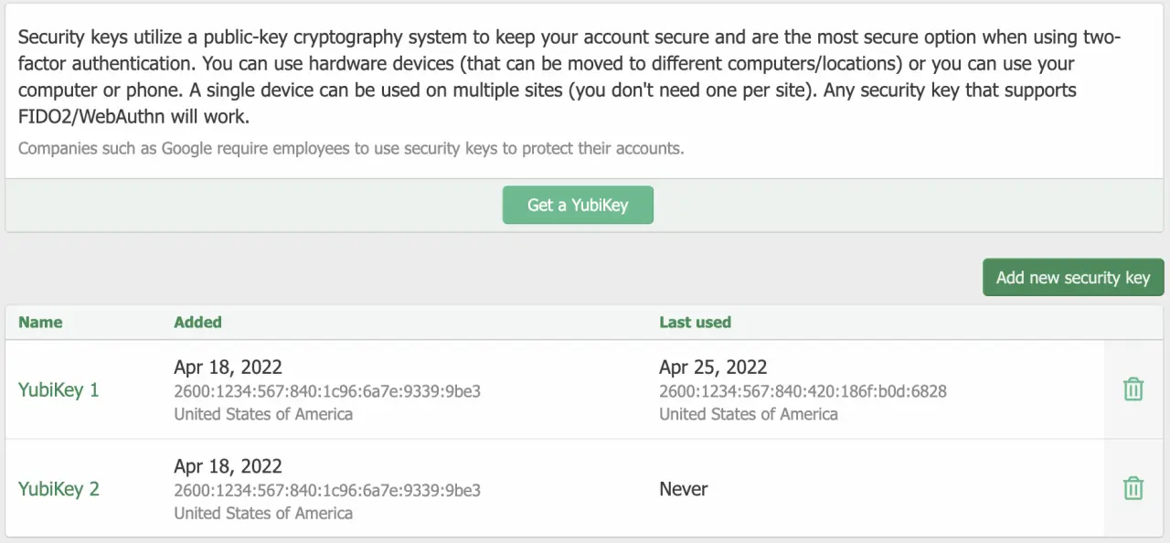 - 支持WebAuthn / FIDO2安全密钥作为两步身份验证(YubiKeys等硬件设备是Google等大型科技公司要求其员工使用的设备,以确保其帐户安全)。